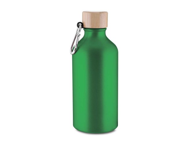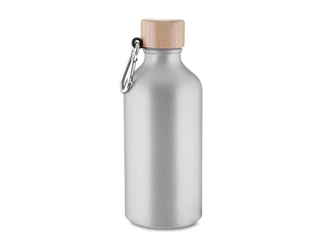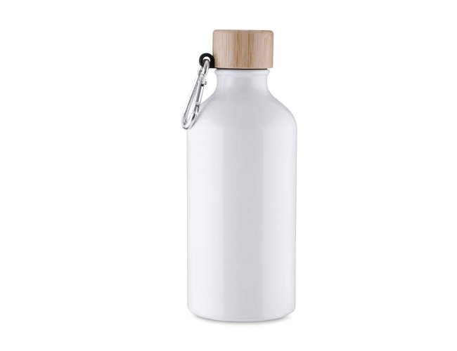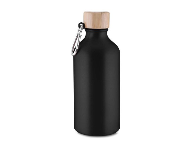 Garrafa de 550 ml em alumínio reciclado com acabamento mate, exceto na cor branca, tampa rosqueável em bambu e mosquetão na tampa.